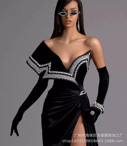 Off shoulder Long sleeve studded bead Sexy fishtail dress with high slit V-neck evening gown