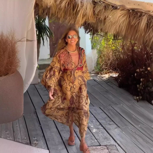 Summer new V-neck fashion print long-sleeved loose dress for women